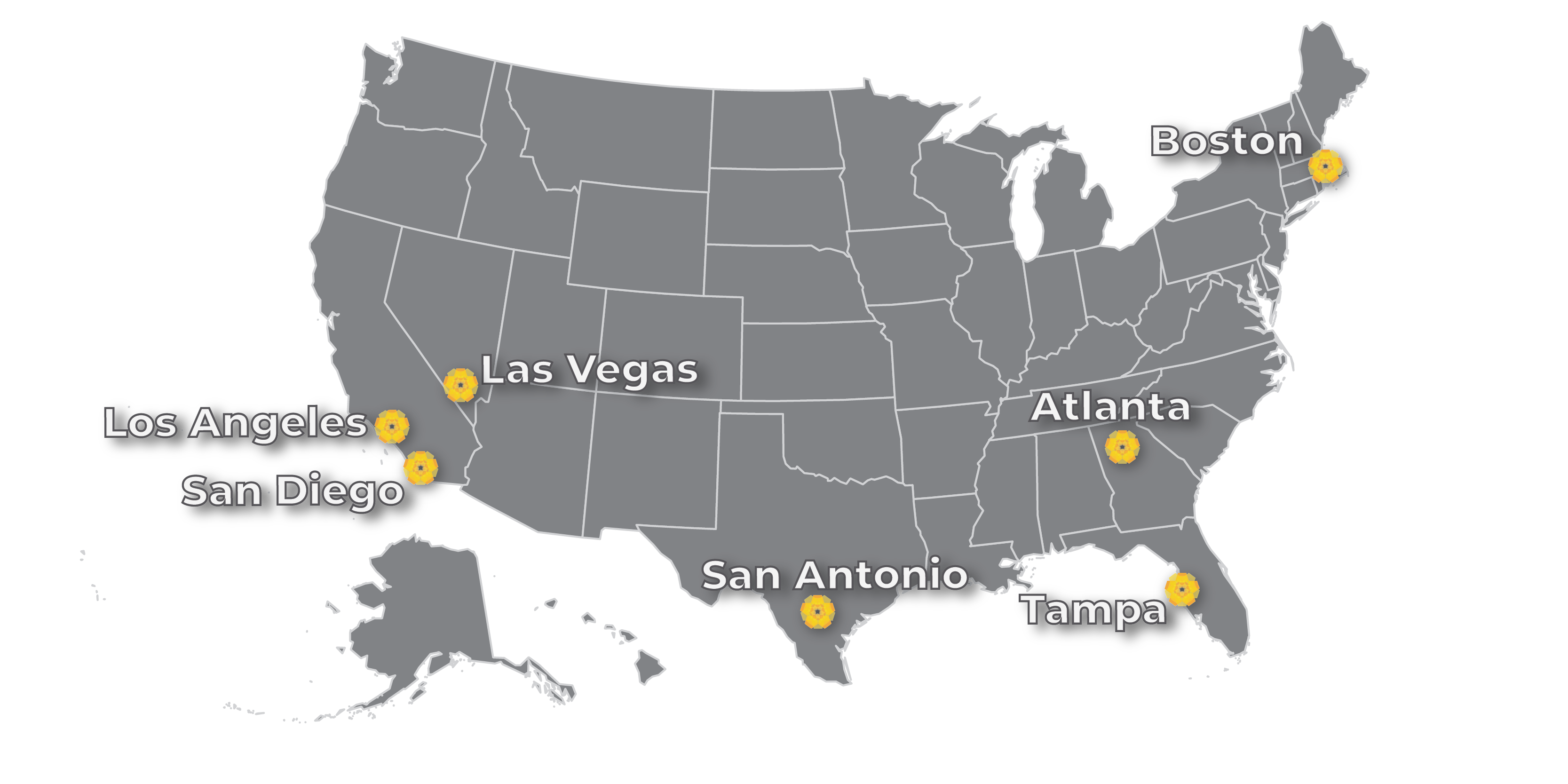 Atlanta, GA • Boston, MA • Las Vegas, NV • Los Angeles, CA • San Antonio, TX • San Diego, CA • Tampa, FL