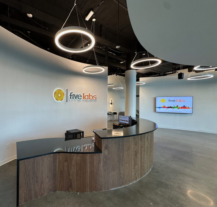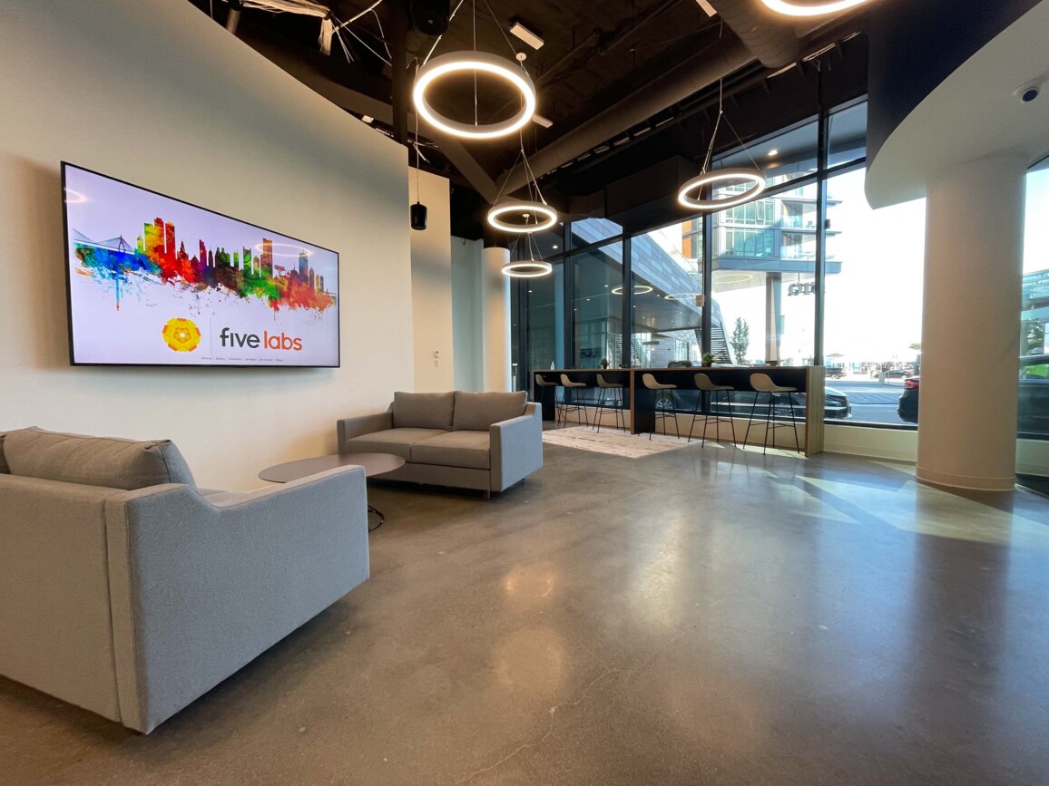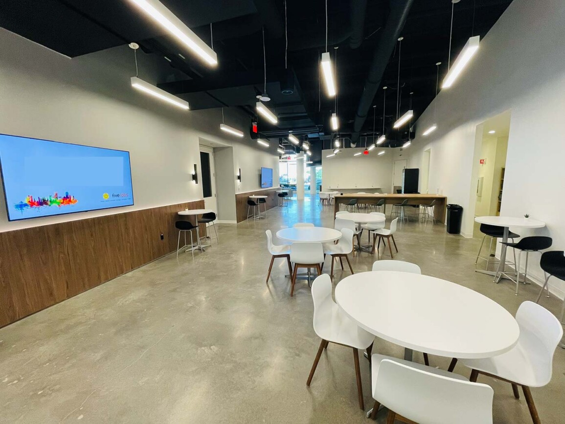 FIVE Labs Boston is equipped with state-of-the-art audio visual capabilities including internal and external broadcasting. The facility has a separate food and beverage area plus smaller collaboration rooms to create a positive learning environment.
