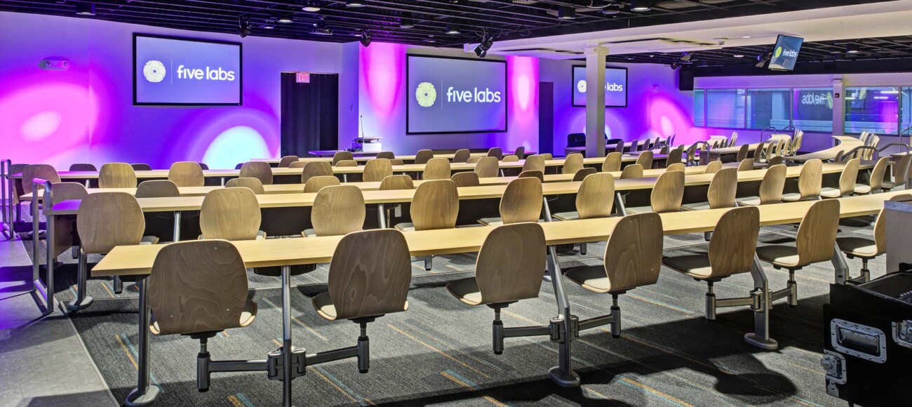 FIVE Labs Tampa boasts a Prototype Lab, an auditorium, a flexible pre-function area, a board room, a collaboration room, a catering kitchen, and an innovation studio all housed in the same facility. The facility has a separate food and beverage area plus smaller collaboration rooms to create a positive learning environment.